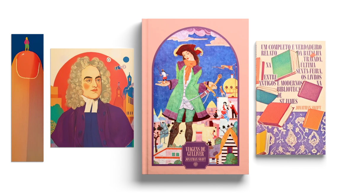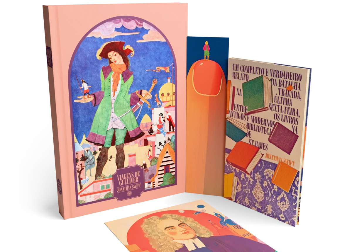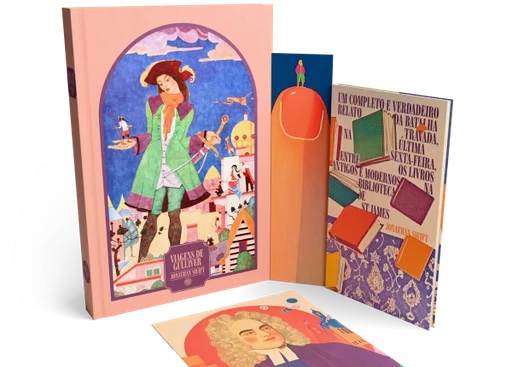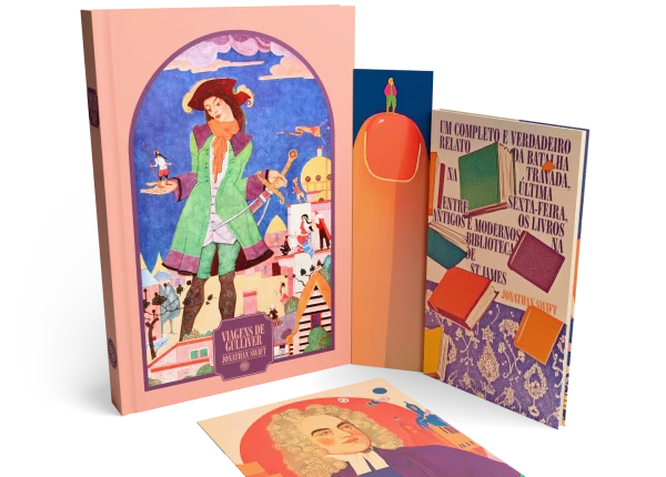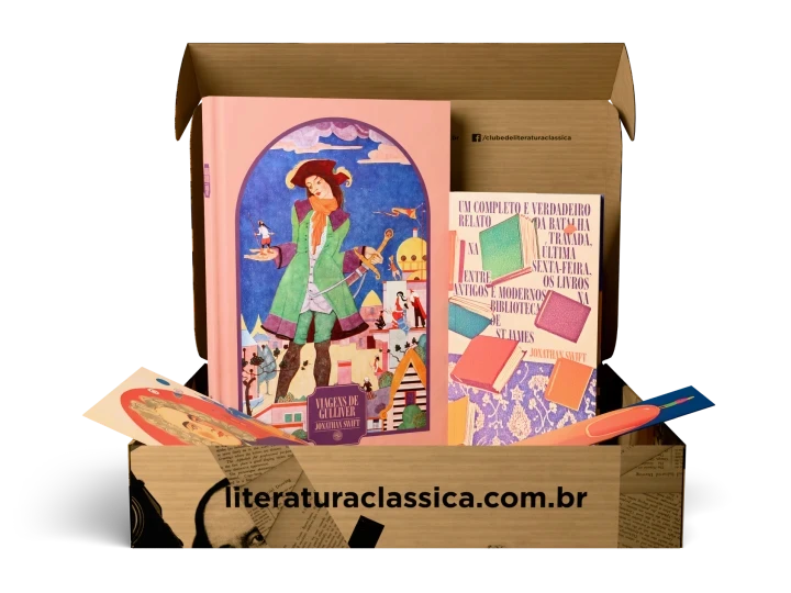 Além do clássico e do livreto, você vai receber um marca-páginas temático e um retrato de Jonathan Swift, o autor dos livros do box deste mês.